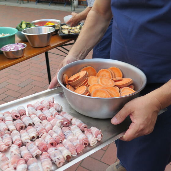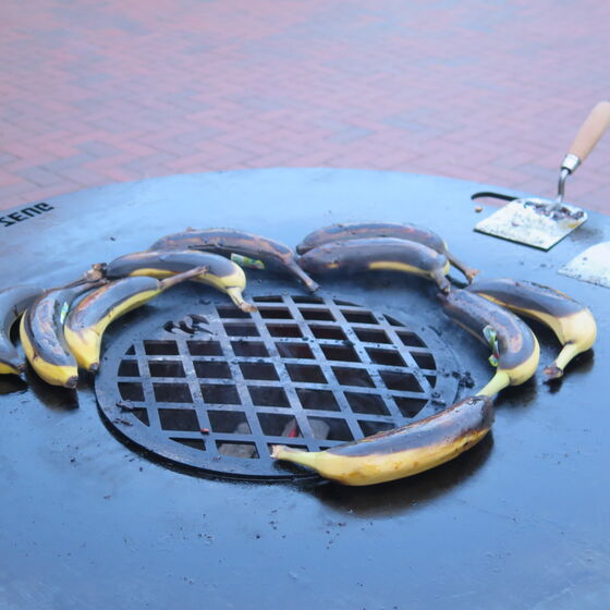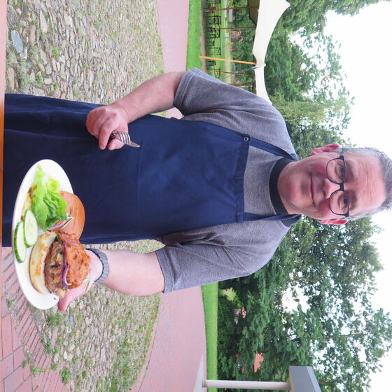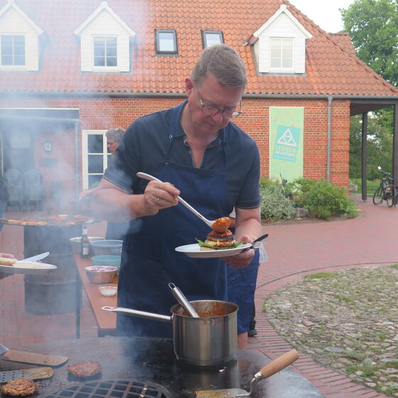 Anschließend wird gekocht – oder besser gesagt: gegrillt. Auf der Feuertonne unter der sogenannten Plancha brutzeln regionale Zutaten: Gemüse, Naanbrot, Obst für das Dessert – und natürlich Burger mit Fleisch vom Becklinger Strohschwein. Hohls beantwortet Fragen und mischt sich unter die rund 20 Teilnehmenden.