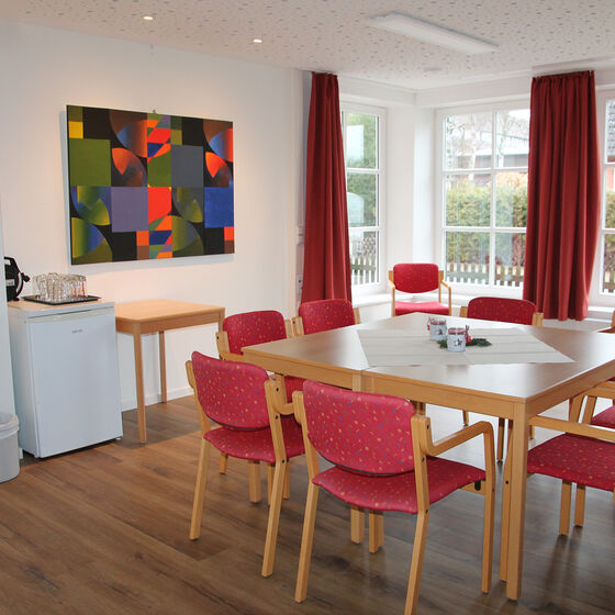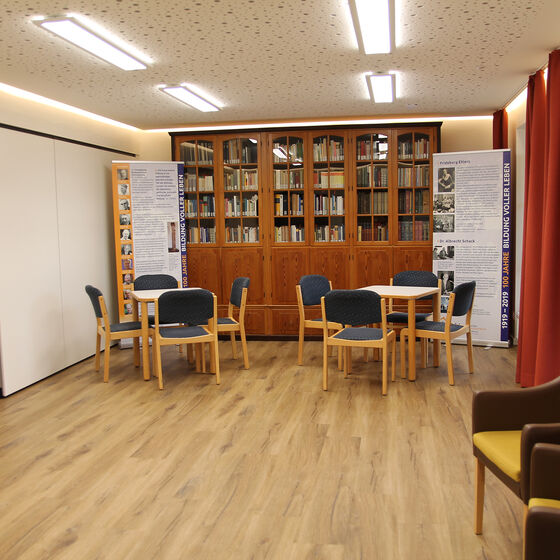 Ähnlich in der Ausstattung, allerdings ohne Bühne und etwas kleiner, ist der Tagungsraum im Haus Birkeneck. Die Panoramafenster, die den Raum von drei Seiten umschließen, lassen das Gefühl entstehen, mitten im Grünen zu sitzen und bieten besonders viel natürliches Licht.