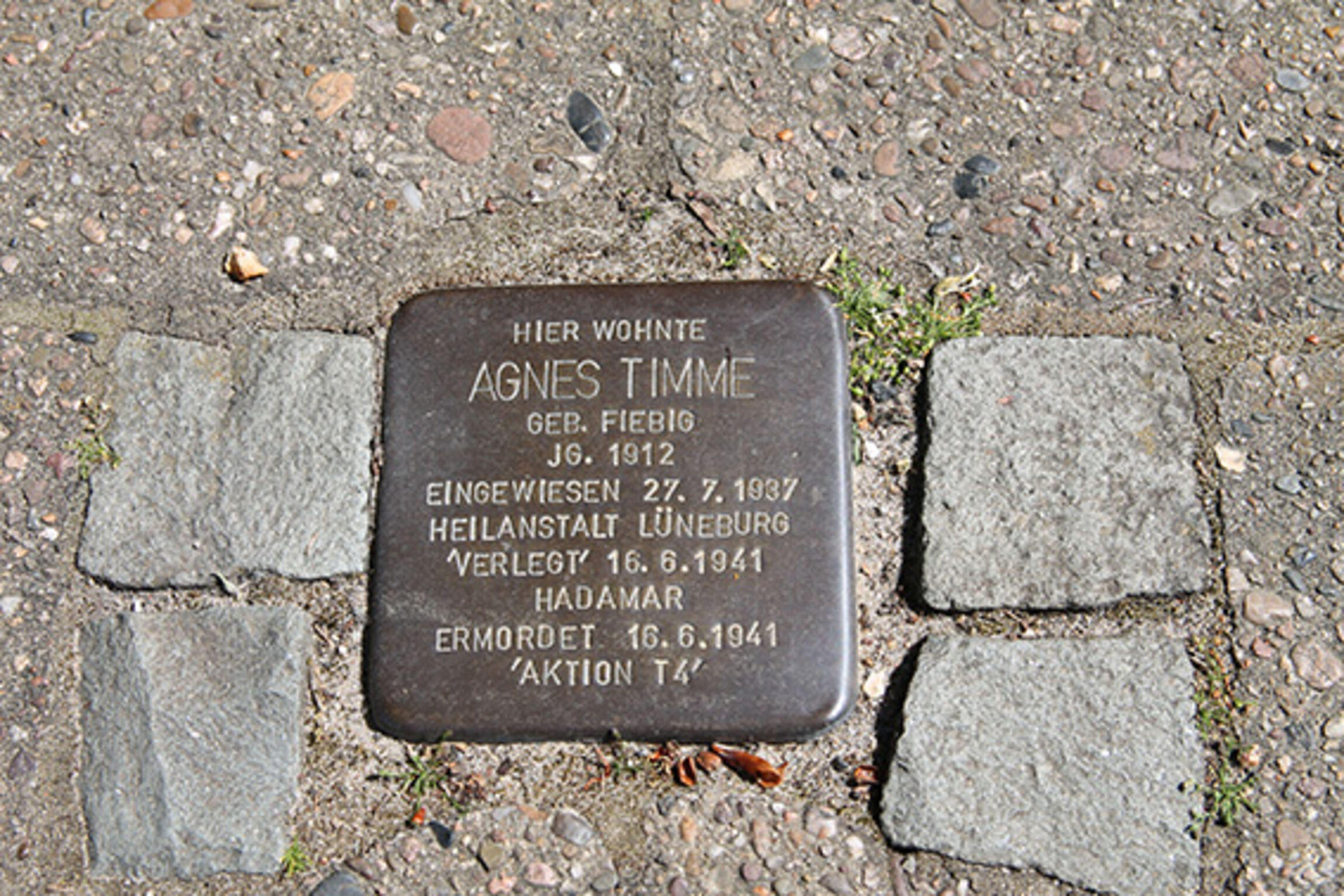 Nachdem sie nach der Geburt ihres vierten Kindes an einer postnatalen Psychose erkrankte, wurde Agnes Timme ein NS-Opfer, obwohl sie weder eine Jüdin noch eine Widerstandskämpferin gegen die Nationalsozialisten war. Im Rahmen des T4-Euthanasie-Programms wurde sie am 16. Juni 1941 im Alter von 29 Jahren in Hadamar vergast.